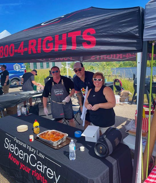 The SiebenCarey tent saw even more enthusiastic participation this year. In addition to Ian and Jim (while not officiating), attorney Cory Whalen and front office manager Susan Tereshko joined John Kripotis from IBEW Local 292 in cooking and serving up ribs with a smile.